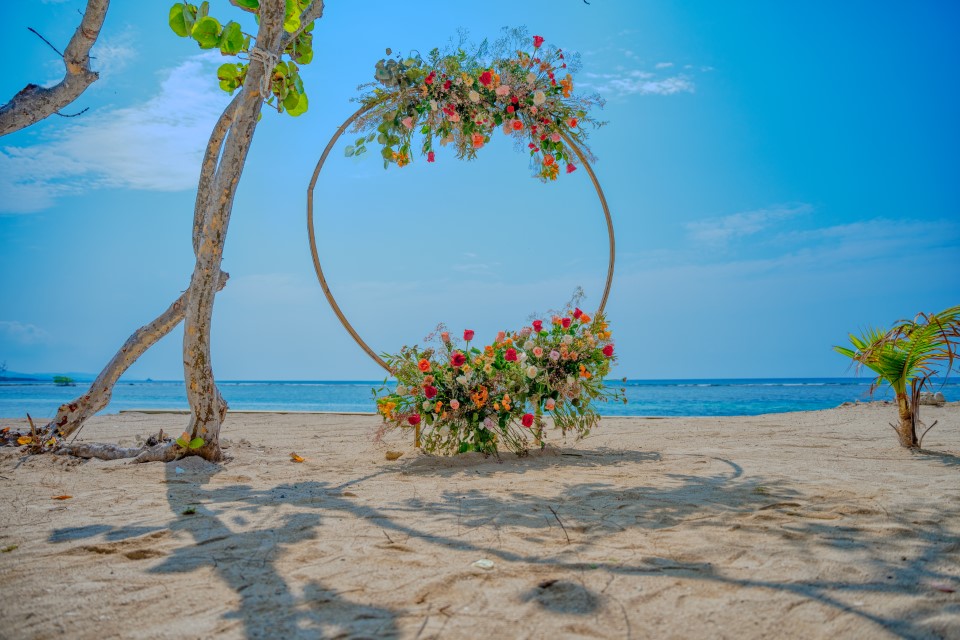 Tambra and her bridesmaids began the day with professional hair and makeup services, creating a relaxed and pampered start to the celebration. The ceremony space was decorated with a beautiful arch filled with vibrant tropical flowers, perfectly complementing the laid-back elegance of a Caribbean beach wedding.
